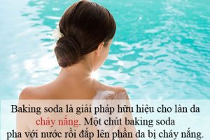 Baking soda là giải pháp hữu hiệu cho làn da cháy nắng. Một chút baking soda và pha với nước rồi đắp lên phần da bị cháy nắng. Bạn có thể dùng để tắm, hoặc hoà tan baking soda với nước ấm, cho vào bình xịt, để lạnh và phun lên vùng da bị tổn hại.