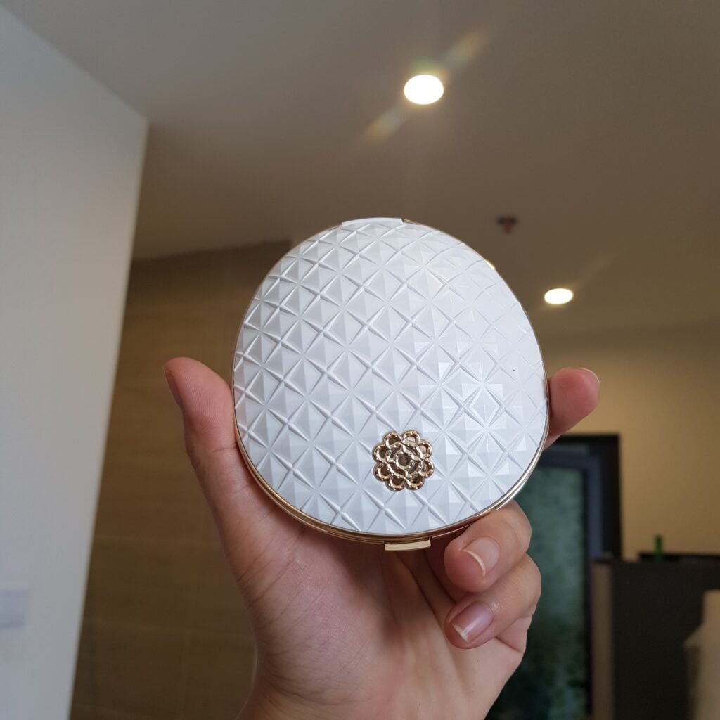 1. Về thiết kế: Vant CC Touch Air khoác lên mình chiếc áo trắng viền vàng đồng quá sang chảnh. Tone màu trắng không bảo giờ lỗi mode. Thay vì thiết kế chiếc hộp tròn vành vạnh truyền thống thì Vant lại có thiết kế tương tự vỏ ngọc trai vừa lạ mắt lại vừa sang trọng; dễ dàng bỏ túi đồng hành cùng phái đẹp trên mọi nẽo đưỡng.