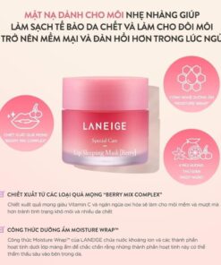 + Ngoài quan tâm đến mặt nạ cho da mặt, mặt nạ mắt thì việc sắm cho bản thân một hũ mặt nạ chuyên dùng cho môi là rất cần thiết. Khi bạn thường xuyên ngồi phòng máy lạnh, hay khi thời tiết trở mùa hanh khô và đặc biệt là những cô nàng hay thoa son thì nạ ngủ giành cho môi Laneige sẽ mang đến cho bạn đôi môi mọng, mướt, mềm mại, lên son chuẩn màu và không bị thâm môi