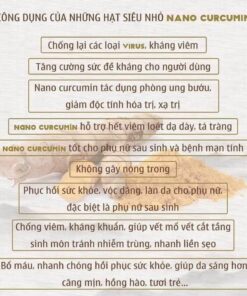 - Nano Curcumin giúp phục hồi làn da, sức khỏe, vóc dáng cho phụ nữ sau khi sinh, Bổ máu, giúp da trở nên hồng hào, tươi trẻ, nhanh chóng hồi phục sức khỏe.