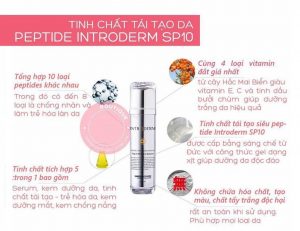 Siêu peptide Introderm SP10 là sản phẩm dược mỹ phẩm cao cấp của Samsung Pharm được cấp bằng sáng chế công nghệ từ Đức với công thức gel dạng xịt dưỡng da độc đáo. Introderm được sản xuất theo công nghệ nano vi nang hạt mỡ đa năng, tăng khả năng hấp thụ và thẩm thấu nhanh chóng đến tận lớp hạ bì. Song song đó, sản phẩm được sản xuất trên dây chuyền công nghệ Non Asepic, chiết rót trong môi trường vô trùng, đảm bảo an toàn cho làn da.